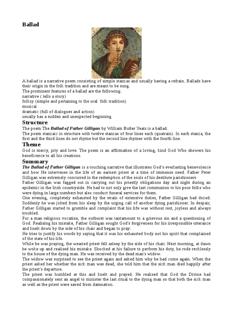 The old priest Peter Gilligan Was weary night and day. A ballad is usually a short narrative poem telling an interesting story. A ballad is a simple poem or a song that narrates a story.