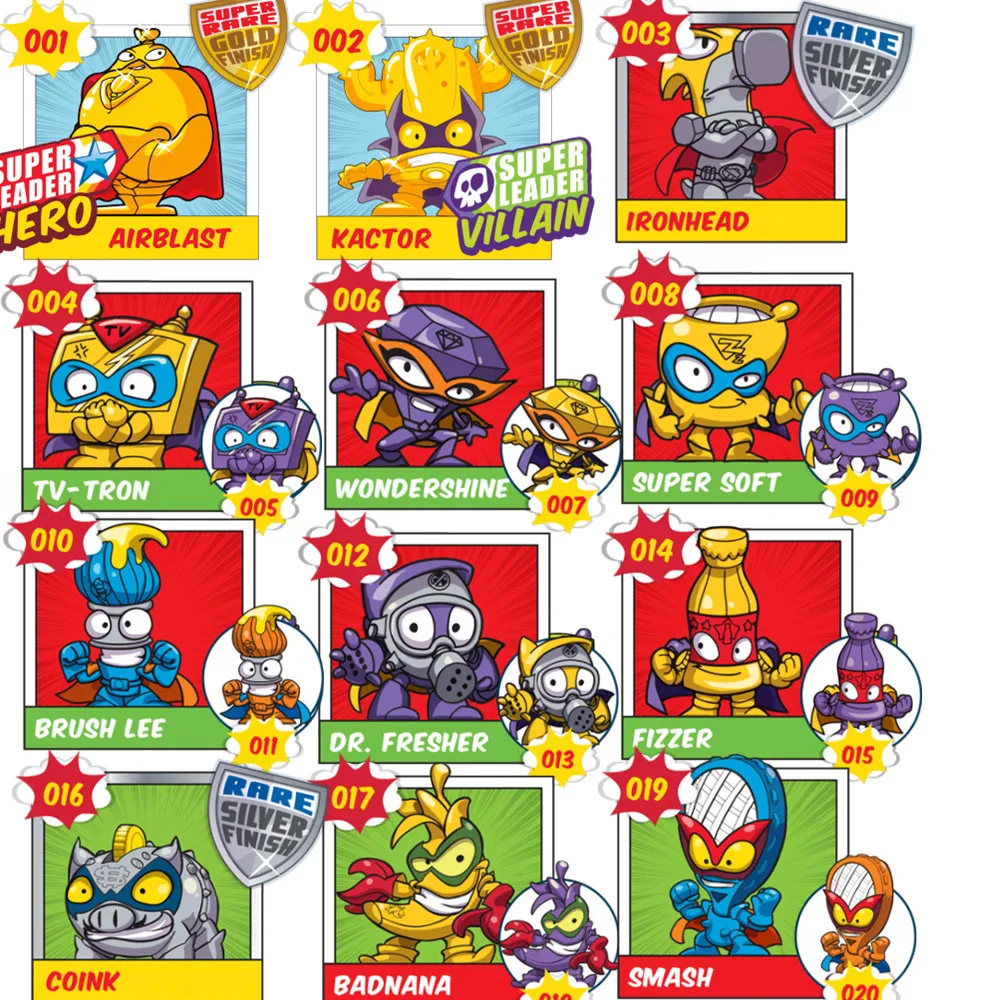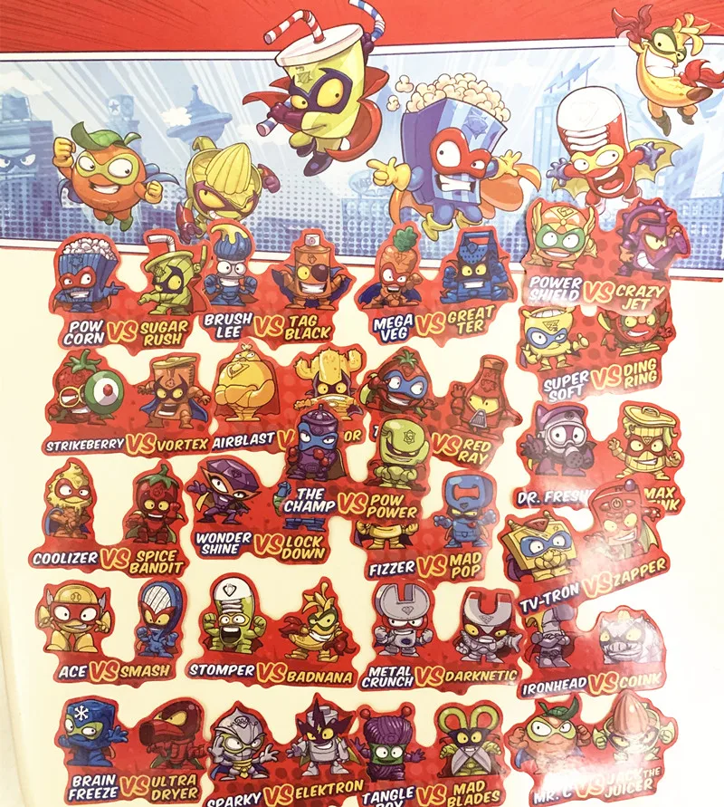 Superzings series 5 characters. Welcome to Kaboom City. Wearing their superhero capes and eye masks there are more than 80 multi-coloured characters to collect each with a matching rival. You get a list in each pack some show each character and their rival.